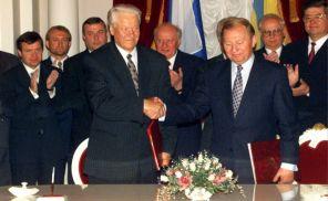 На фото: Борис Ельцин (слева) и Леонид Кучма (справа) после подписания пакета российско-украинских документов, 1997 год. (Фото: ТАСС)